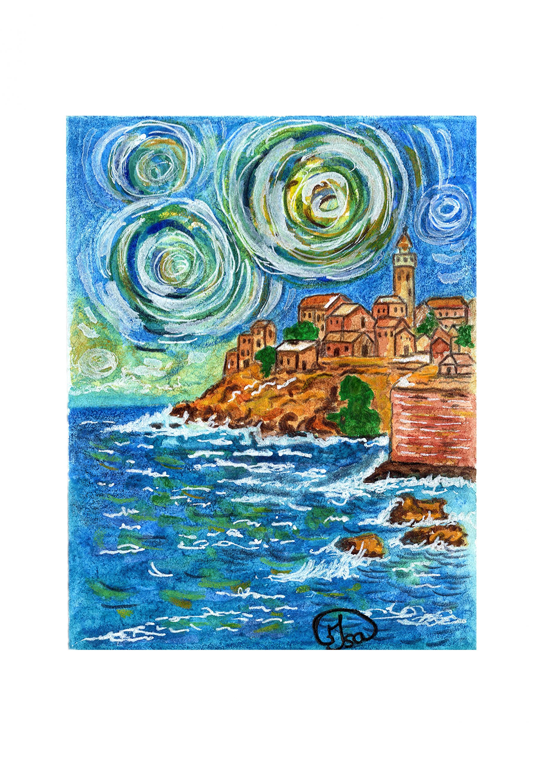 Un charmant village pittoresque perché sur une colline, peint à la façon de Van Gogh.